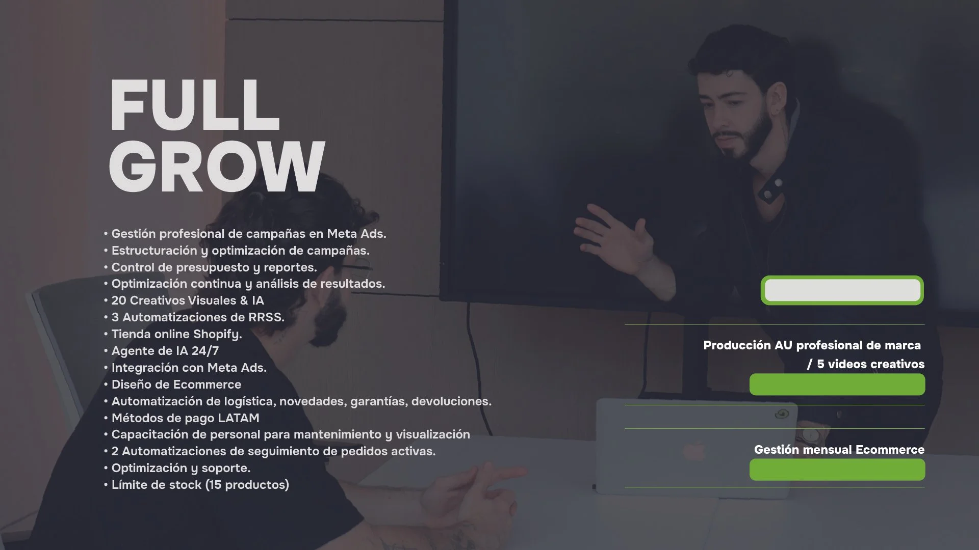 Tienda online + campañas profesionales + IA 24/7 atendiendo clientes + producción audiovisual de marca. Este plan está pensado para negocios que quieren escalar en serio, con automatizaciones inteligentes, seguimiento de pedidos, estrategia continua y soporte real. Todo integrado, todo optimizado.